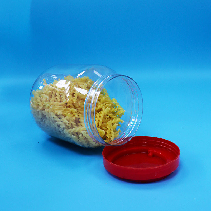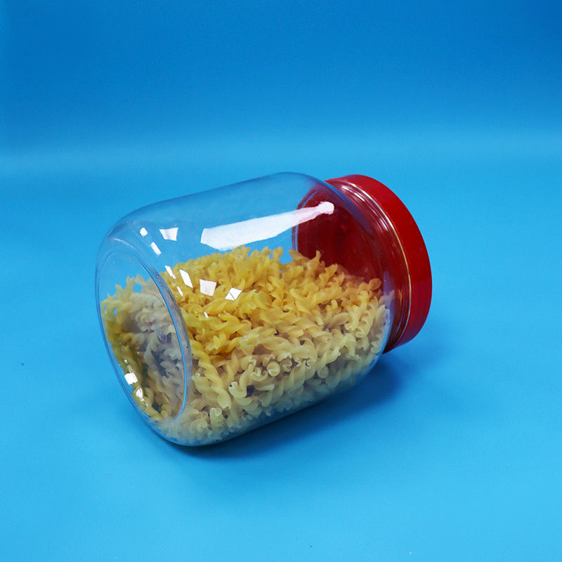 Hũ hình trụ trong suốt bằng nhựa PET miệng rộng đựng bánh kẹo, nắp vặn màu đỏ